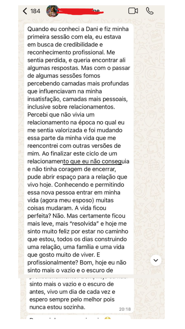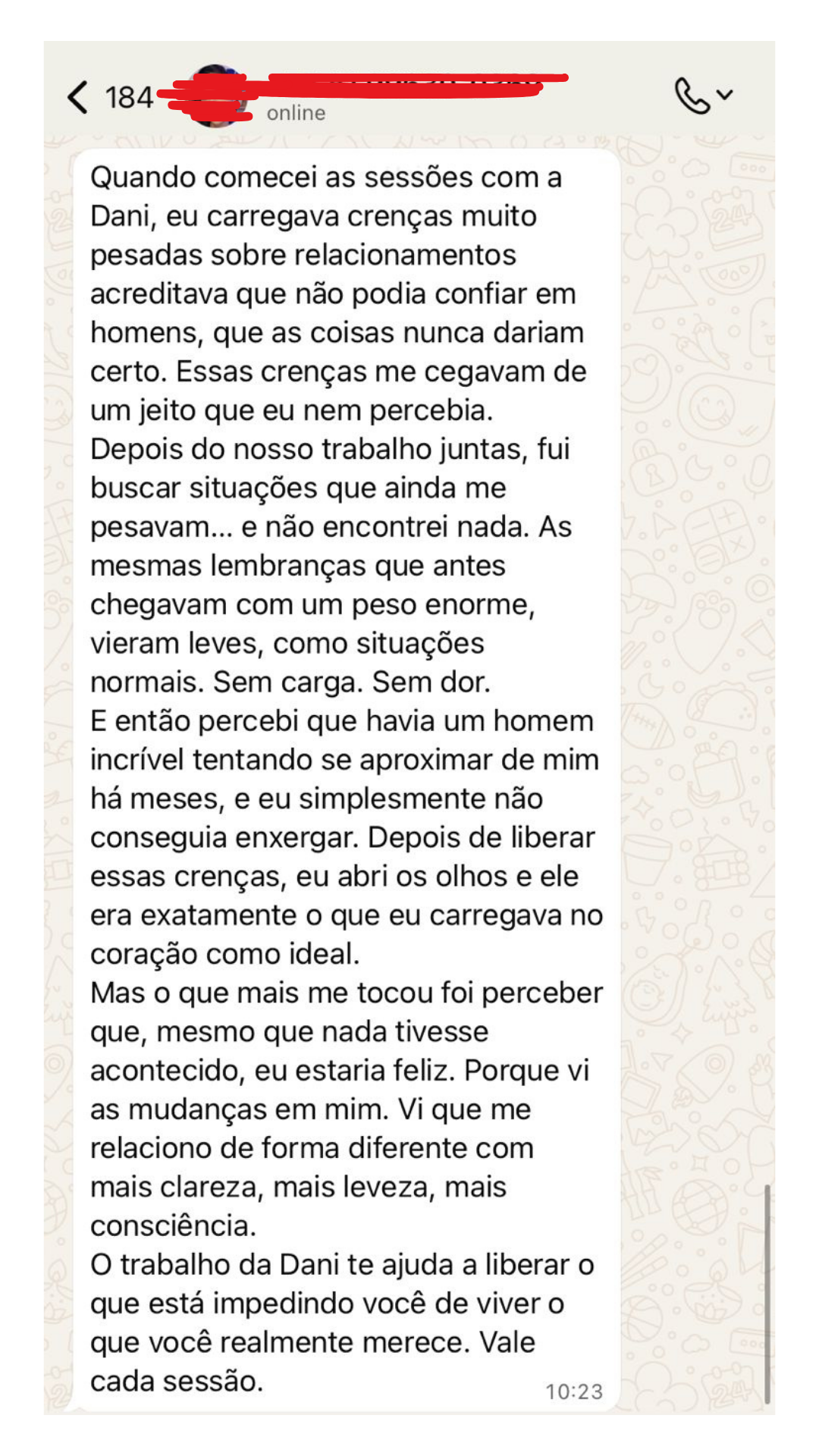 Existe um alívio profundo que acontece quando alguém finalmente nomeia o que você carrega — sem julgamento, sem protocolo genérico. Muitas clientes descrevem esse momento como a primeira vez que alguém realmente as viu.
