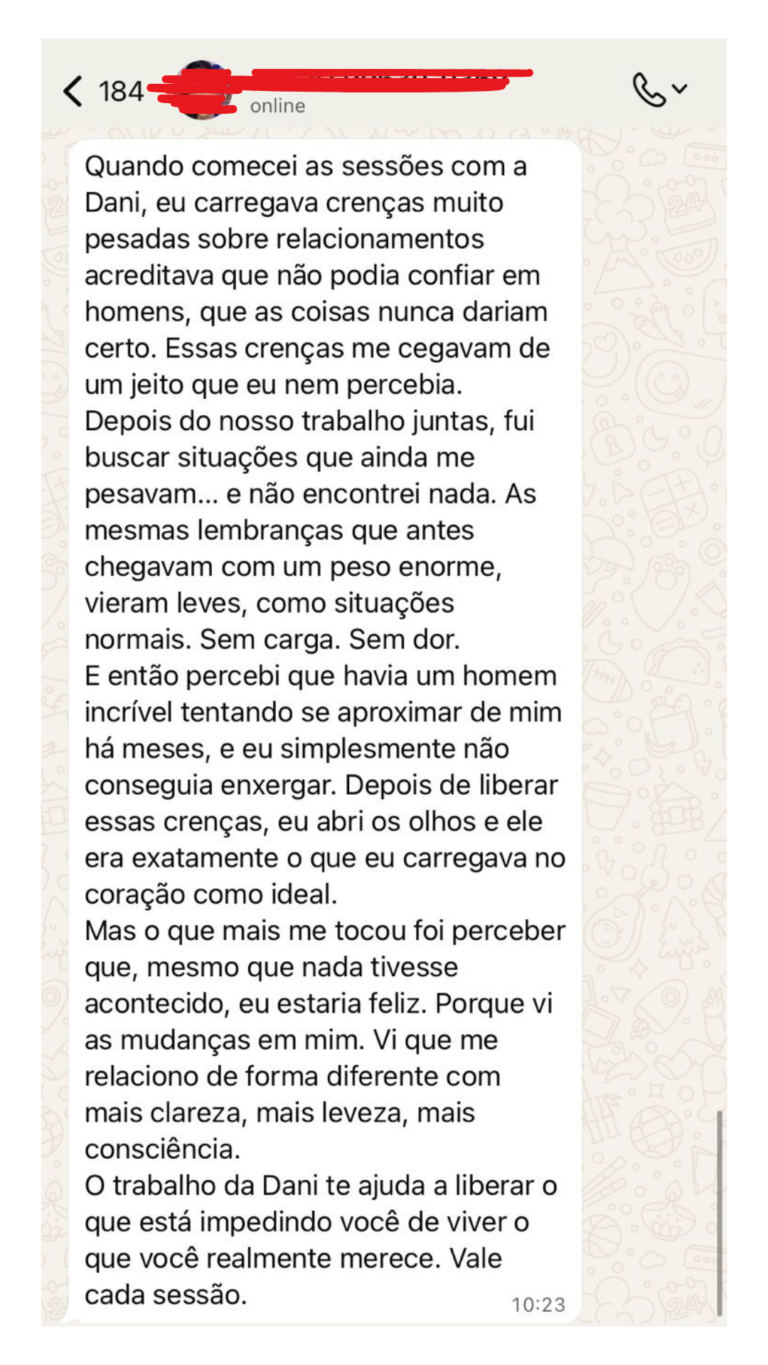 Dani Lima é especialista em Raiz dos Padrões Emocionais, com 7 anos de atendimento e clientes em mais de 8 países. Ao longo desse tempo, desenvolveu a Leitura da Raiz — um processo único que combina leitura intuitiva e análise do Desenho Humano para identificar com precisão o registro emocional inconsciente que sustenta a repetição na vida de cada mulher.